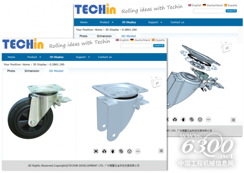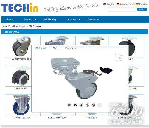 德馨五金(TECHIN)官网上的脚轮产品3D展示效果