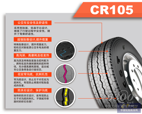 在产品研发上,CR105轮胎作为一款专为纯电动巴士、公交设计的全轮位轮胎,特殊的胎面复合胶料配方,低发热耐磨耗。三沟直线花纹设计,增加了花纹块大小,提升了花纹块刚性。哑铃式防夹石设计,可有效避免沟槽频繁夹石问题。
