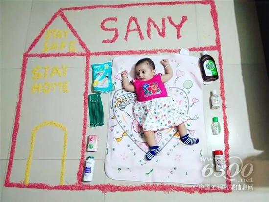 小宝宝住在“SANY”小房子里,身边放满了防疫用品,百毒不侵。