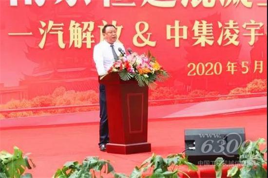 主持人开场后,交付仪式正式开始。南京恒建混凝土有限公司总经理凌刚登台致辞。凌总表示,南京恒建在搅拌运输行业发展多年,为了积极响应政府“以人为本、环境优先、全力打造绿水青山”的号召,在此次采购中,经过同行业多家公司的对比,最终决定投入4000多万签订90台一汽解放&中集凌宇搅拌车,相信这次合作一定会实现双赢。
