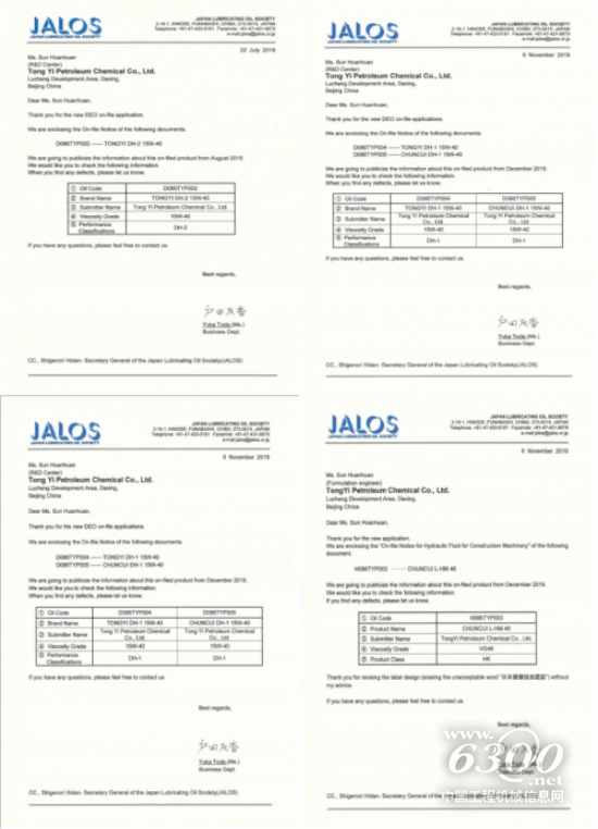 凭借强悍的性能,统一石化液压油连续获得多项国际标准组织认证,取得博世力士乐(BOSCH REXROTH)、JCMAS HK(日本建机协会)、Denison HF-0(丹尼逊)、Eaton(伊顿)、Cincinnati(辛辛那提)认证,能够满足全球主流液压泵的技术要求。同时,亲水型液压油C1,达到了卡特彼勒非道路设计标准。此外,统一石化旗下顶峰PEAK工程机械产品也获得沃尔沃原厂OEM认证。更值得一提的是,统一石化包括“CHUNCUI L-HM 46”“TONGYI DH-2 15W-40””TONGYI DH-1 15W-40”“CHUNCUI DH-1 15W-40”在内的多款产品获得日本汽车标准组织“JASO”认证。