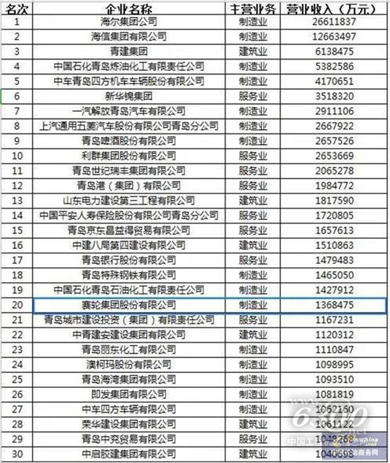 6月11日,在青岛年度经济成就奖颁奖典礼上,2019年青岛企业100强发展报告正式发布。赛轮集团入围2019青岛企业营业收入百强名单,位列青岛百强企业第20位,青岛制造业企业第10位。