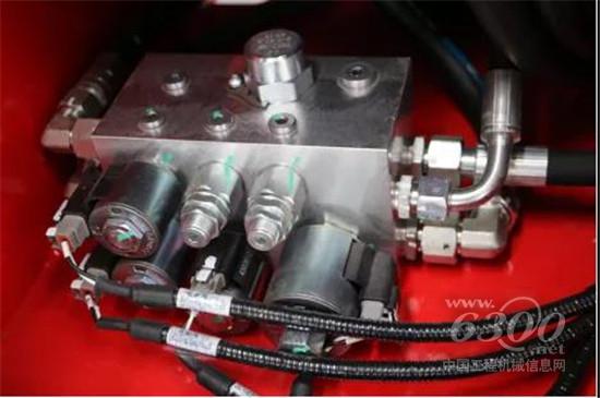 举升功能阀可控制平台举升、支腿伸缩及转向动作,并可通过比例阀实现动作速度控制,一步到位,节省作业时间;行走功能阀内置分流集流阀,以此实现两个执行元件的速度保持同步或定比关系,防止车辆打滑;前桥浮动设计,通过后桥与底盘的倾角变化控制前桥的浮动油缸的伸缩,来实现行驶的平顺性和操纵稳定性;液压油温度超过50~55℃时,开启液压油散热器,可保证设备持续正常运转。