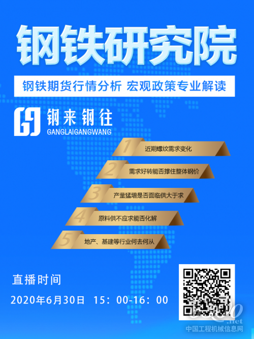 为帮助钢材从业人员了解行业宏观环境政策,钢材现、期货走势以及钢铁产业前沿技术的发展,钢来钢往“钢铁研究院”将于2020年6月30日 下午15:00-16:00迎来新一期的直播节目。本期我们为大家邀请到了金属矿业行业分析师王英武和华泰期货研究所所长、“我的钢铁网”资深分析师刘滨两位大咖来到直播间,与粉丝交流互动,探讨业内话题。届时,主持人以及两位嘉宾将对行业热点资讯、钢材供给和价格走势等问题进行深入讨论。