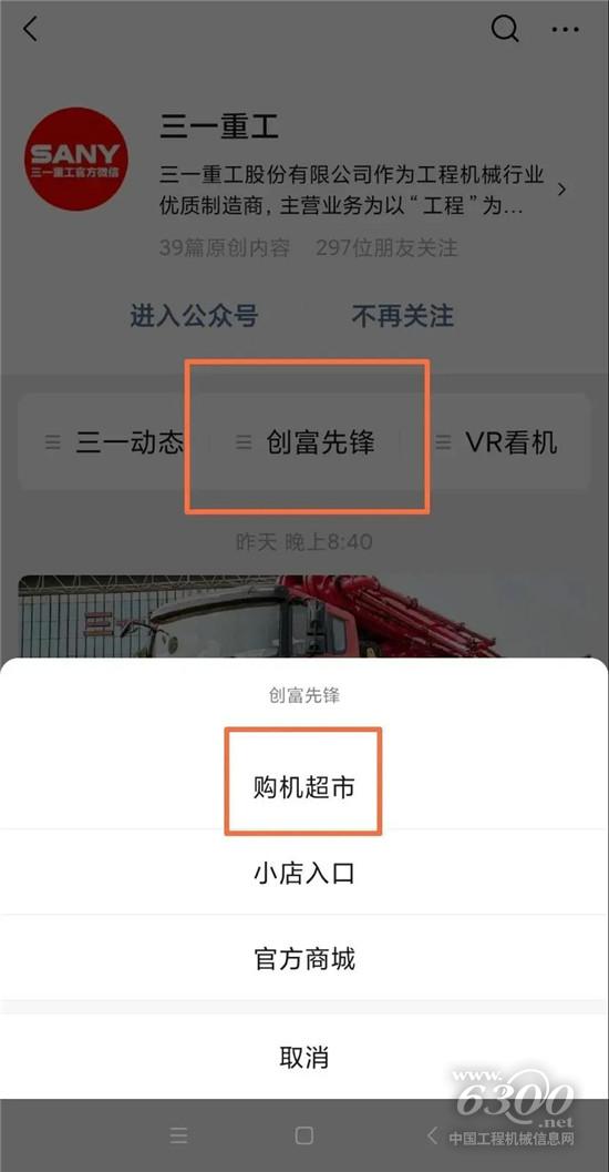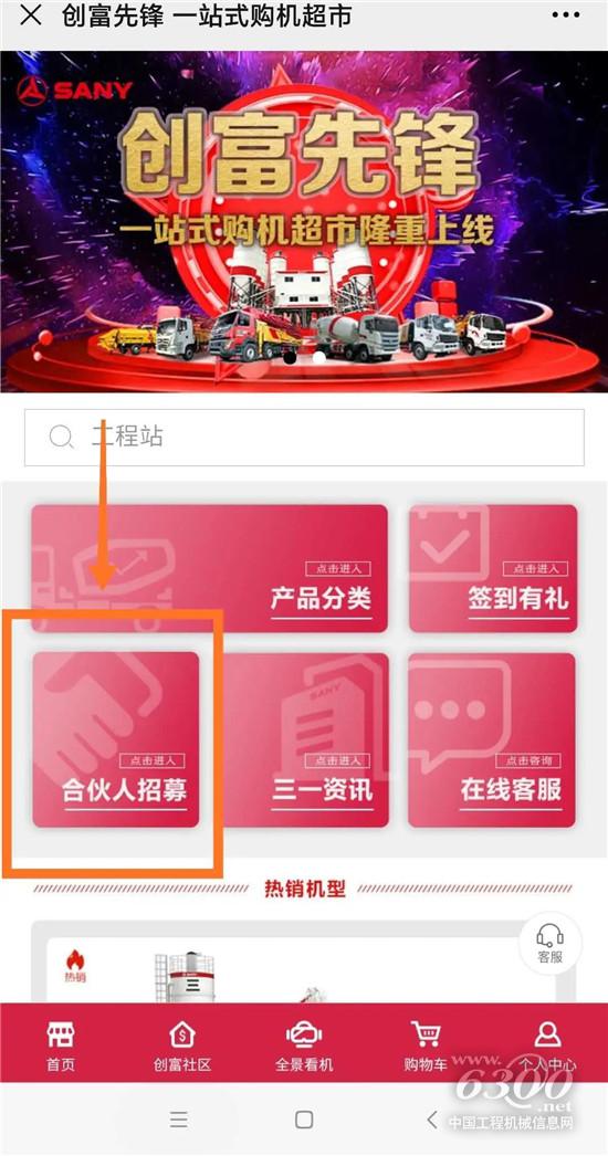 方式二:关注微信号【三一重工】,点击菜单栏【创富先锋】——进入【购机超市】,点击合伙人招募,填写信息,注册成为合伙人。
