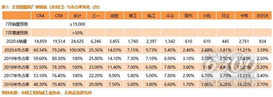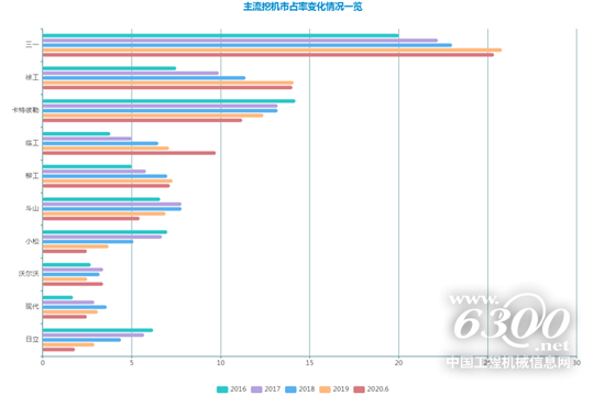 上图是十大挖机品牌:三一、徐工、卡特彼勒、临工、柳工、斗山、小松、沃尔沃、日立、现代从2016年到2020年6月在我国的销量及市占率的整体数据。