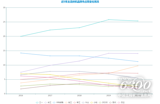 然而,对于这种趋势,我们只有一个模糊的概念——国产挖机市占率提升,国外品牌市占率下降。但主流的几个挖机品牌具体有怎样的变化呢,下面,我们就来一一地看一下。
