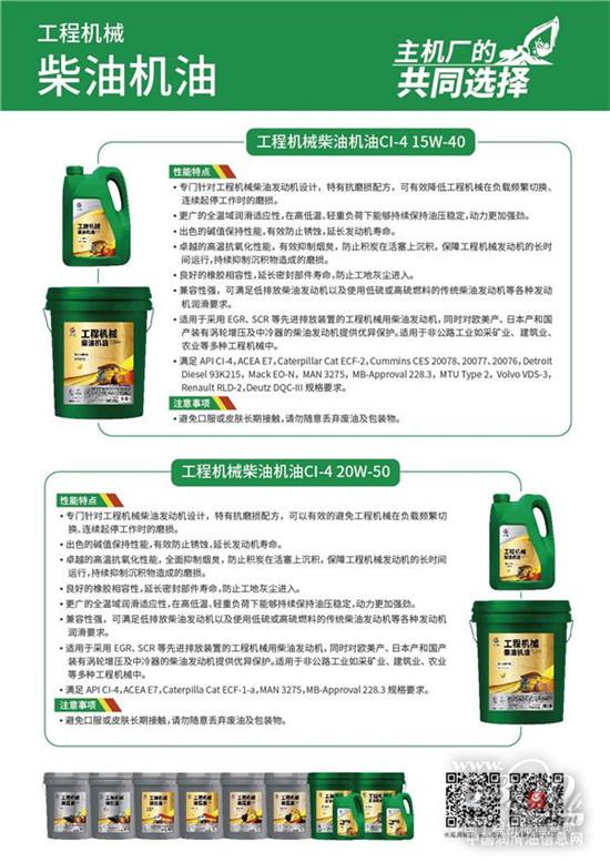 在工程机械润滑领域,中国石化长城润滑油出品的新一代工程机械柴油机油,支持API CI-4,ACEA E7,Caterpillar Cat ECF,MAN 3275等行业最新规格。在抗磨、防腐、防锈、清洁度和换油周期等硬指标上全面领先,适用于采用EGR、SCR等先进排放装置的工程机械柴油机。同时提供15W-40、20W-50两种粘度规格,满足欧美、日本、国产不同类型柴油机的细分需求。