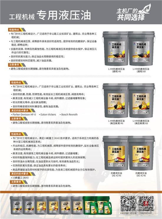 通用型“L-HM抗磨液压油”可广泛应用于非公路工业如采矿、建筑、农业等工业机械,防锈、防腐、密封及抗氧化性优秀,适配机械液压泵、阀,保护设备顺畅运行。“高压高清”及“AE-K”两系列液压油,进一步提升寿命和高压工况性能,能够满足Parker、Eaton、Bosch、川崎重工等液压部件及整机企业的产品需要。