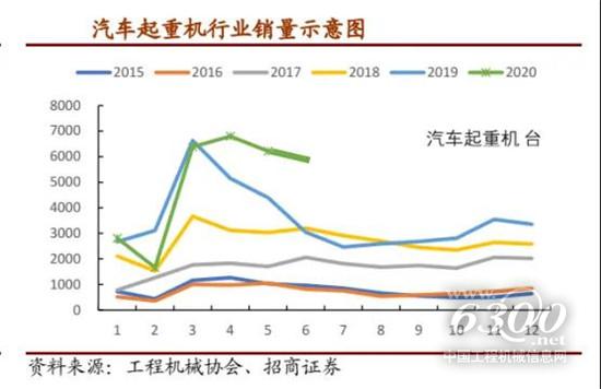 1-6月累计销售汽车起重机29326台,同比上升17.2%。其中国内销量28160台,同比增长16.74%。出口销量1166台,同比下降15.4%。