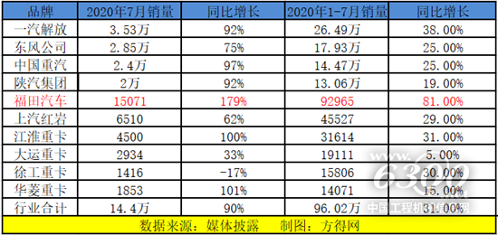 1-7月,我国重卡市场整体销量预计96万辆,同比累计增长31.1%,比前6月涨幅扩大6.7个百分点。前10强企业全部实现正增长,有4家企业累计涨幅超3成。数据显示,1-7月,解放、福田、江淮、徐工,4家企业重卡销量累计增幅分别为38.3%、80.8%、31.3%、30.3%,涨幅均超3成。