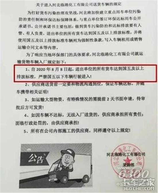 在这些地区也有不少工厂、港口等响应政府的号召禁止国四及以下排放标准车辆驶入厂区装卸货,直接断了国四车主的货源。比如河北临港化工有限公司、山钢日照公司、日钢公司、华能电厂、山东集装箱发展公司等,而这些正是很多车主赖以生存的货源。
