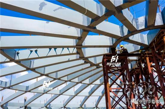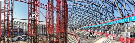 目前,“一场两馆”(体育场、体育馆、训练馆)二次结构砌体任务完成80%,室内精装修工作正大面积推进,金属屋面拼接安装工作即将启动,“飞舞的浪花”造型雏形已现,预制看台也开始吊装,训练场和会议中心主体结构施工接近尾声,室外工程正同步推进。