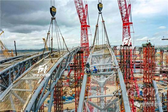 今年5月7日亚青会主场馆进行钢结构首吊,7月12日亚青会主场馆跨度最大的钢结构管件——巨型拱桁架启动吊装,经过中建八局南方公司建设者们近四个月的奋力拼搏,8月30日,随着最后一品桁架吊装拼接完成,宣告全部钢结构建设完成。