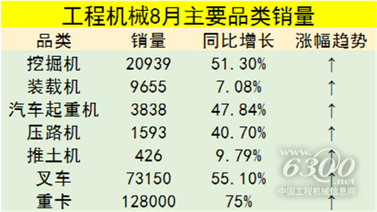 根据可查数据显示,8月单月,包括挖掘机、装载机等在内的七大品类产品销量均呈增长态势。