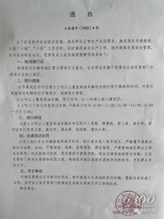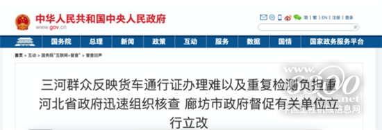 在国务院互联网督查平台,有一名来自河北廊坊三河市的卡友爆料当地通行证办理乱象,据他介绍,三河市3.5吨以上重型柴油车辆24小时禁止驶入全市建成区,也就是说城配的主力军总重4.5吨的轻卡也在全天禁行范围之内,如需进入可办理通行证。