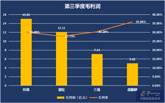 从上表我们看出,森麒麟在净利润和毛利润的绝对值上虽还未达到玲珑、赛轮的规模,但各项数据的增幅却都位居第一。其中第三季度净利润的增长率更是达到了73.47%。可以说在第三季度的轮胎财报中,森麒麟这份答卷异常的靓丽耀眼。