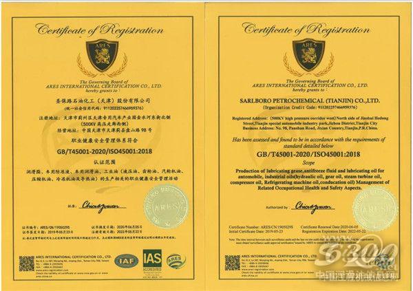 2020年6月,圣保路石油化工(天津)股份有限公司正式获得了ISO9001质量管理体系、ISO14001环境管理体系和ISO45001职业健康安全管理体系共三项认证。规范化、标准化和可持续的生产管理体系得到认可,而这即是圣保路润滑油不断进步追求国际标准的见证,更是圣保路润滑油生产高质量产品的保障。