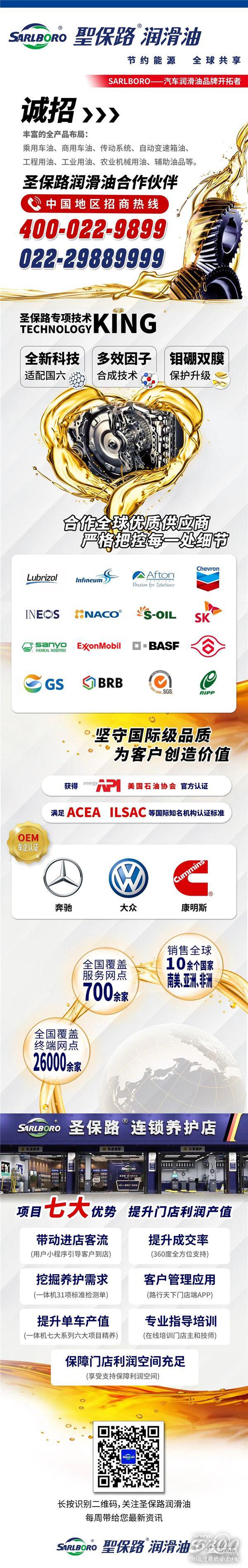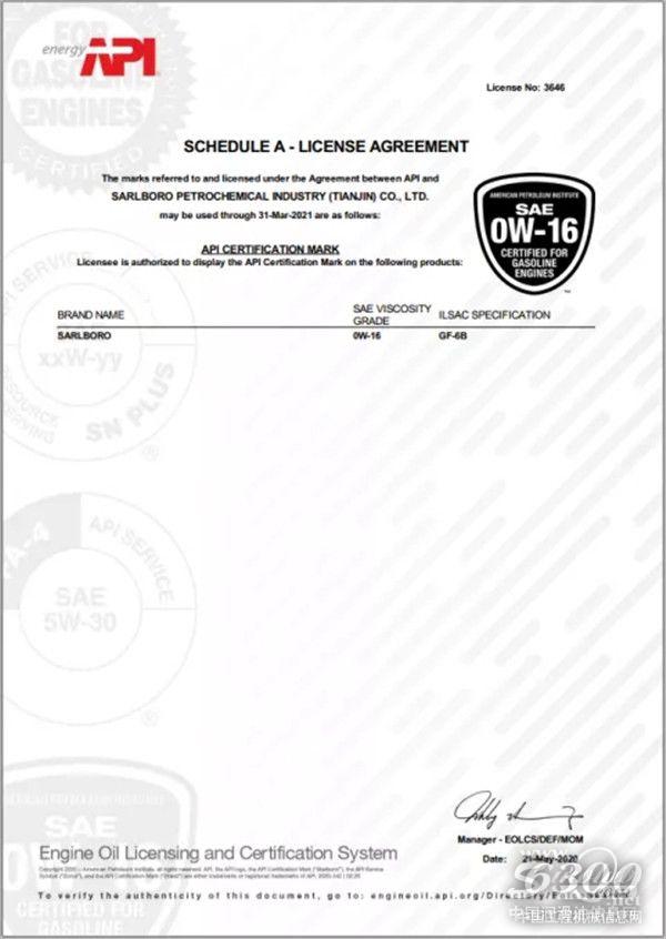 旗下SP级别润滑油SARLBORO(0W-16 SPGF-6B)、SARLBORO(0W-20 GF-6A)、SARLBORO(5W-20 GF-6A)、SARLBORO(5W-30 GF-6A)全部获得美国石油协会API认证证书。不仅全系列满足国六阶段排放标准,并且其中的SP/GF-6 0W-16粘度的醇酯全合成汽油机油更是符合GF-6B规格,满足采用超低粘度等级润滑油的发动机的用油需求。