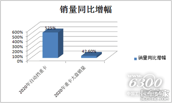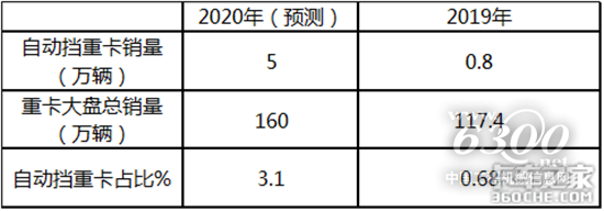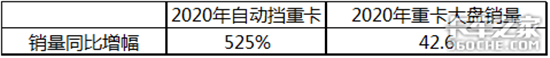 上图表数据反映出两个信息:一是自动挡重卡占比目前只有3%,虽然同比占比增加2.3个百分点,但相对重卡整体市场来说市场份额仍然很小;二是2020年自动挡重卡销量相对2019年同比大涨525%,增速远远大于重卡整体市场42.6%增幅,自动挡重卡正呈现快速增长态势。