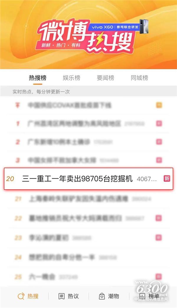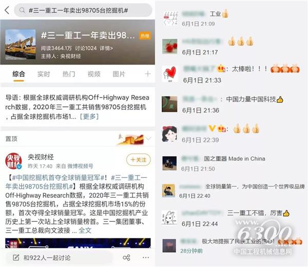 中国力量,世界冠军!6月1日,三一挖掘机首夺全球销量冠军冲上微博热搜,目前#三一重工一年卖出98705台挖掘机#、#挖掘机到底哪家强#、#中国挖掘机首夺全球销量冠军#等相关话题累计阅读量已超1.4亿。