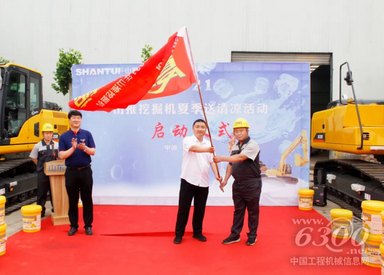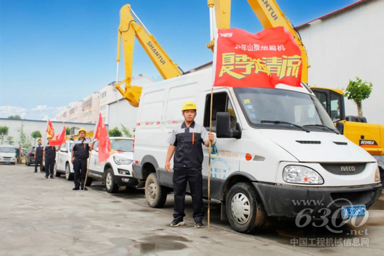 在服务人员接过象征责任和使命的大旗后,山推挖掘机客户服务部齐东良部长宣布山推挖掘机2021年“夏季送清凉”活动正式出征,一辆辆售后服务车踏上了“夏季送清凉”服务之旅。