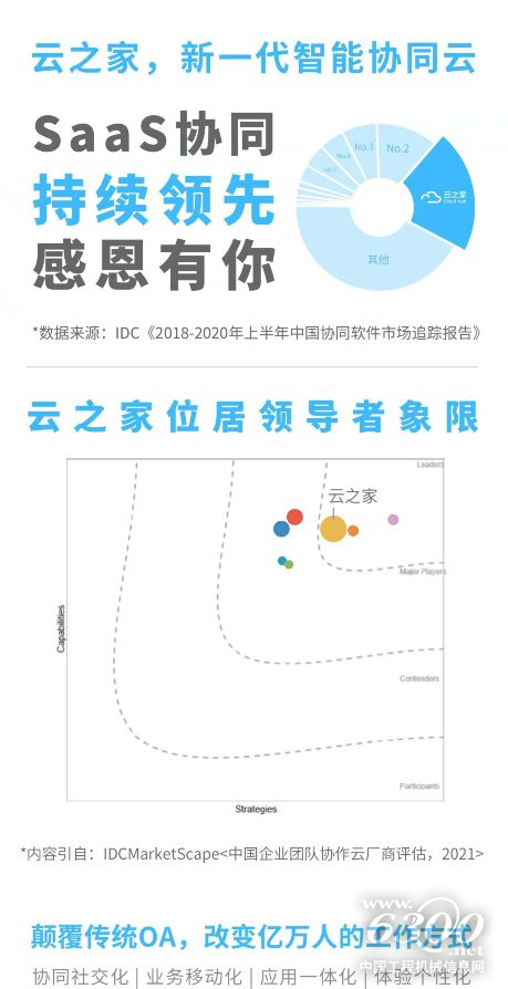 云之家是面向企业服务的移动办公平台&新一代智能协同云,我们坚持以客户为中心,以奋斗者为本,以全心全意为企业服务、改变亿万人工作方式为公司使命,致力于成为值得托付的移动办公行家。据研究机构IDC数据显示,2015年起云之家连续三年蝉联大中型企业移动办公市场用户数第一;2018年至今持续摘冠中国SaaS协同软件市场;2021年IDC发布的《中国企业团队协作云2021厂商评估》报告中,云之家位居领导者象限。