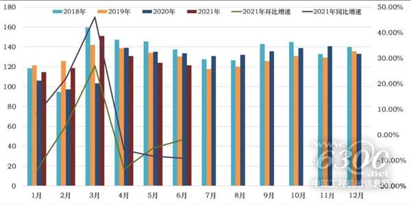 2021年6月份中国工程机械市场指数即CMI为120.47,同比降低9.13%,环比降低1.93%,依据CMI判断标准,100<CMI≤130 稳定发展,市场不温不火,但要警惕市场下行风险)。2021年6月份中国工程机械市场指数同比、环比增速均降低,且同比降幅略大于环比降幅,表明国内工程机械市场6月的热度要逊于上年同期。