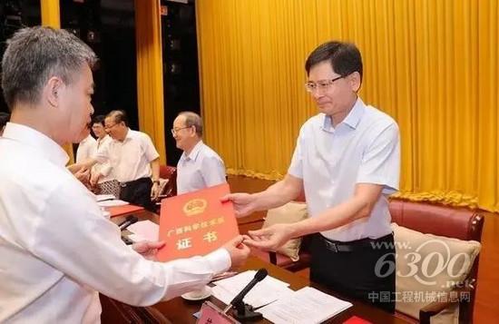 ·自治区主席蓝天立(右一)为玉柴获一等奖项目第一完成人沈捷颁奖。