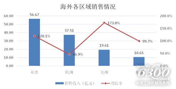 分区域看,公司在全球主要市场及三一美国、三一印度、三一欧洲等海外事业部销售实现高速增长,亚澳区域56.67亿元,增长120.05%;欧洲区域37.51亿元,增长46.85%;美洲区域19.61亿元,增长173%;非洲区域10.65亿元,增长99.72%。