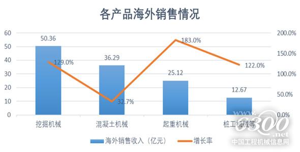 分产品看,公司主要产品海外销售均实现高速增长,挖掘机销售50.36亿元,同比增长129.04%,混凝土机械销售36.29亿元,同比增长32.71%,起重机械销售25.12亿元,同比增长182.97%,桩工机械等其他产品销售12.67亿元,同比增长121.98%。