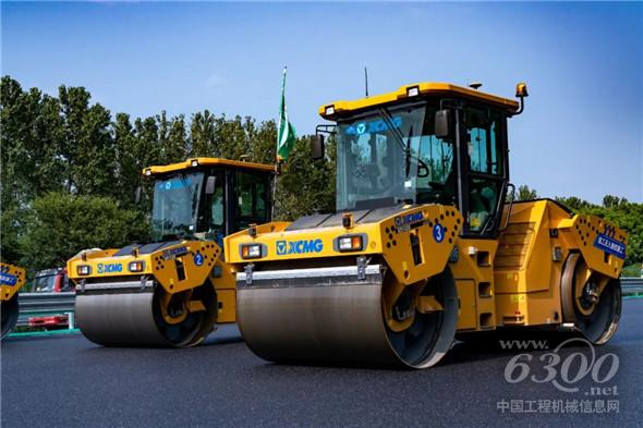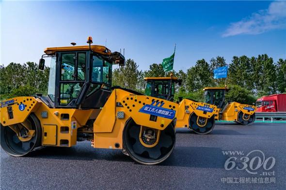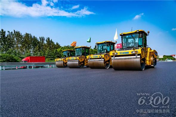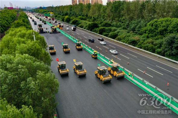 宁沪高速苏州段施工现场,10台徐工双钢轮压路机、2台徐工大宽度摊铺机组成的无人驾驶摊压机群,正在井然有序地进行沥青层面协同摊铺碾压作业。