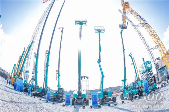 △依次错落摆放的起重与高空机械成套装备。