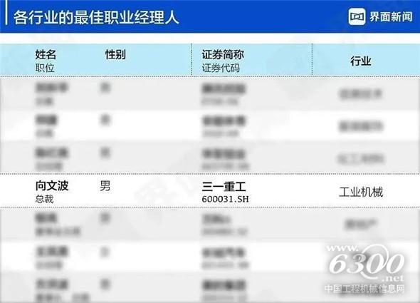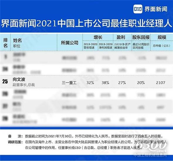 近日,界面新闻发布2021中国上市公司最佳职业经理人榜单,列出了50位优秀的职业经理人,三一重工总裁向文波榜上有名,位列第25,同时也是工程机械行业的最佳职业经理人。
