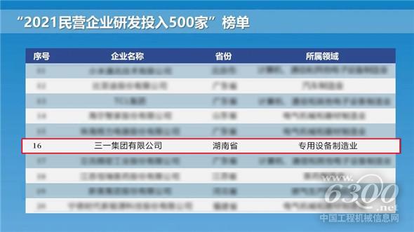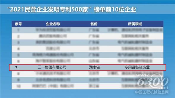 10月11日,全国工商联发布“2021民营企业研发投入500家”“2021民营企业发明专利500家”榜单,三一集团高位入选,分别排名第16、第7,均居专用设备制造业第一。