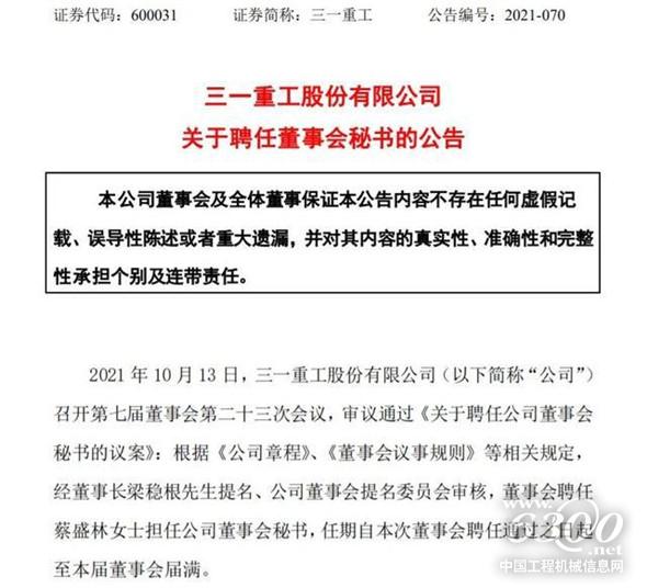另外一份则是董事会秘书聘任的公告。公告称,2021 年 10 月 13 日公司召开第七届董事会第二十三次会议,审议通过《关于聘任公司董事会秘书的议案》,董事会聘任蔡盛林女士担任公司董事会秘书,任期自本次董事会聘任通过之日起至本届董事会届满。