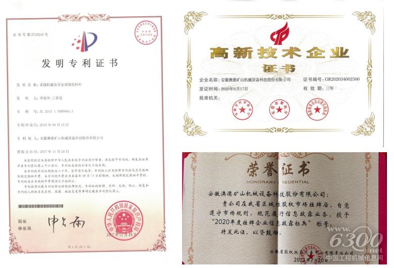 安徽澳德矿山机械一直坚持走“科技兴企、科技强企”之路,在科技创新中谋发展道,始终专注采煤机、截齿、金刚石钻头系列产品的创新研发生产。研发生产的“澳德”牌系列产品荣获国家“实用新型专利”33项、“发明专利”30项。被安徽认定为“国家高新技术产品”、“省重点新产品”,先后获煤炭工业部科技进步二等奖和安徽省科技进步三等奖。