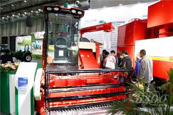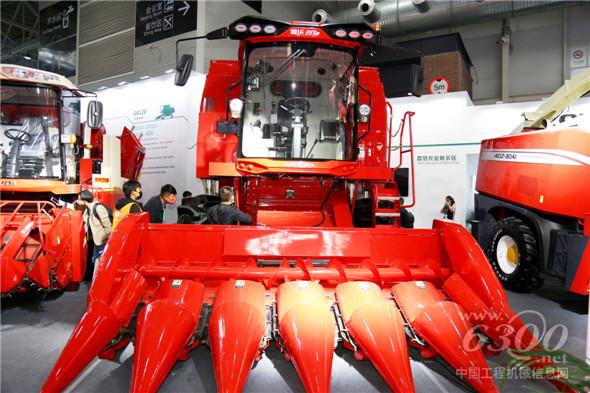 霸气外露的雷沃谷神GK120轮式谷物收获机在展会上吸引了诸多与会嘉宾的驻足,"大而强"已成为它的专属名词。整机采用单纵轴流脱粒分离技术,滚筒速度及脱粒凹板间隙无级可调,调节范围大,作业高效;应用220马力双功率发动机,可根据作业工况选择不同功率,节能环保;割台传动轴采用万向节传动,解决了传统机型双排链联接,传动轴断裂的难题;配备GPS智能终端,可实现车辆定位、状态检测等多种功能,此外还配备多路监测报警控制系统及作业负荷自动控制系统。仅通过更换割台,调整主机部件工作参数即可实现玉米籽粒、大豆、小麦等多种不同作物的收获,是真正意义上的"一机多用"产品。