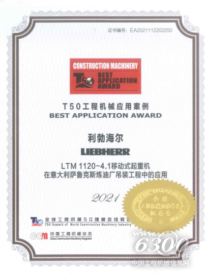 其中,利勃海尔获得2021全球塔式起重机制造商10强中的TOP5;并凭借70吨级PR776静液压推土机与利勃海尔明星吊车产品LTM1120-4.1优异的表现,荣膺“2021 T50工程机械应用案例”。