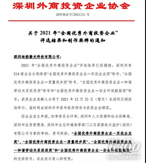 百超迪能凭借对深圳市发展的积极参与和与中国产业伙伴的广泛合作,获评“全国优秀外商投资企业-双优企业”、“全国优秀外商投资企业-质量进步奖”、“全国优秀外商投资企业-和谐劳动关系促进奖”和“全国优秀外商投资企业-安全环保鼓励奖”(2021年度)四项殊荣。