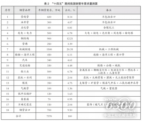 据机械行业钢材消费统计,在机械行业用钢中,管材占比为10%,据此测算,如机械行业年用钢量约为1.5亿吨,则机械行业年用钢管量为1500万吨左右。其中,工程机械每年消耗钢管约70万吨。