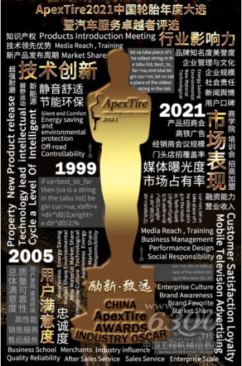 “ApexTire2021年度大选”立足于用户体验和第三方专业测评数据,以专家导师团的全球视野和专业精神,对评选高标准原则的坚持和底线思维的坚守,全媒体平台和矩阵资源对终端的渗透力,赢得国际一线品牌和中国知名自主品牌对ApexTire的支持和厚爱,用户消费者对品牌和产品的满意度将是ApexTire年度大选的核心权重, ApexTire2021年度大选“公信力强、影响力大、互动性好、美誉度高、渗透力深、传播力广”的6A品牌内核将成就“轮胎行业年度奥斯卡”。