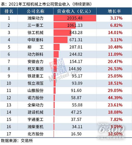 从营业收入来看,17家工程机械上市公司均实现营收正增长。其中,诺力股份涨幅最高,同比增长44.39%。