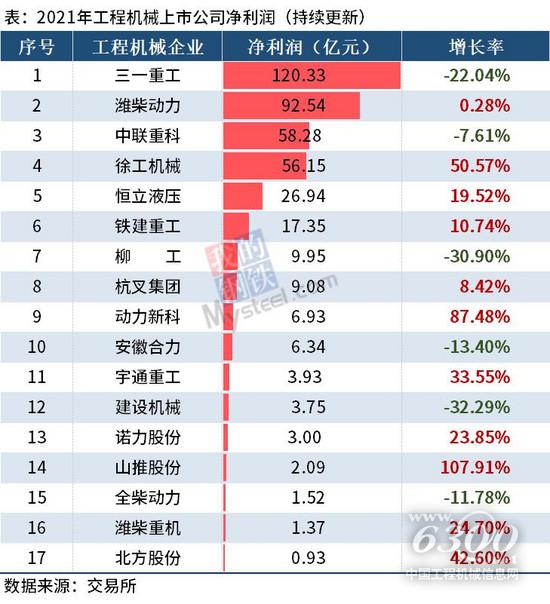 据Mysteel不完全统计,截至4月24日,有17家工程机械上市公司发布2021年度业绩报告,合计实现营业收入5970.54亿元,净利润420.48亿元。