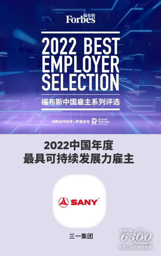 7月8日,福布斯中国联合全球领导力咨询公司——罗盛咨询公司正式发布2022福布斯中国•最佳雇主系列评选结果,三一集团荣获“2022中国年度最具可持续发展力雇主”称号,是榜单中唯一的装备制造企业。