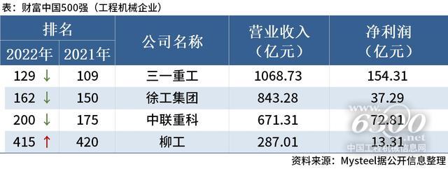 7月13日,2022年财富中国500强榜单发布。据统计,工程机械主机制造商共4家企业上榜,分别是三一重工、徐工集团、中联重科、柳工。其中,仅柳工一家企业排名较2021年上升了5名,三一、徐工、中联三家企业排名较2021年分别下降20名、12名、25名。从上榜企业经营业绩来看,4家企业总营收达到2870.33亿元,同比增长9.5%;净利润249.13亿元,同比下降10.3%。和上一年相比,今年上榜工程机械企业的营收虽然有所增长,但净利润降幅明显。根据中国工程机械工业协会行业统计数据,2021年纳入统计的25家主机制造企业,共计销售各类挖掘机械产品342784台,同比增长4.6%。但国内市场销量274357台,同比下降6.3%。