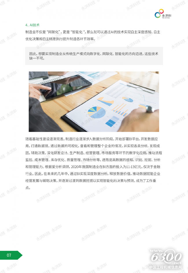 数据分析是实现制造企业数字化转型网络化阶段的基础条件,其主要特征是让数据在各业务链和管理线中自由流动,将各个环节串联并进行关联性分析,实现全流程的数字化管理与提升。智能化阶段的重点在于以量定产、以产定采等精准化、个性化、定制化的生产模式,最终实现社会资源的精准与高效配置。这便需要通过数据的深度挖掘,洞察和预测市场需求。在实际业务中,很多企业的数据参差不齐,多来源于企业中的不同部门以及外部数据,数据的可靠性、可用性无法得到保障。而AI在应用方面的问题,恰恰是BI的优势。BI的可视化能力、敏捷易用性、数据准备能力、高性能处理能力等都可让AI借力。