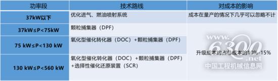 从国三到国四,不同功率段非道路移动机械采用不同的排放控制技术,增加成本有所不同。