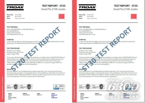 Smart Fix安全围栏系统成功承受2100焦耳的高能量冲击,网络面板和立柱吸收了所有的撞击能量并留有更大的塑性变形空间。撞击后,宽700mm的面板偏差量ST20约427mm,ST30为375mm,宽1500mmST20约为430mm,ST30为375mm。尽管承受了如此大的撞击能量,整个安全围栏系统没有任何部件脱离,而且Smart Fix连接件没有任何变形,成功有效地防止危险源穿透危险区域。
