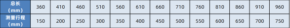 图3: 紧凑型增量式直线时栅位移传感器标准可选测量行程与尺寸对照表